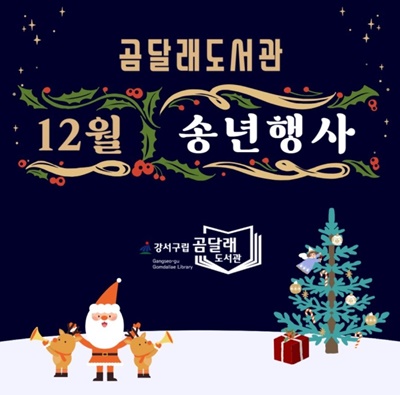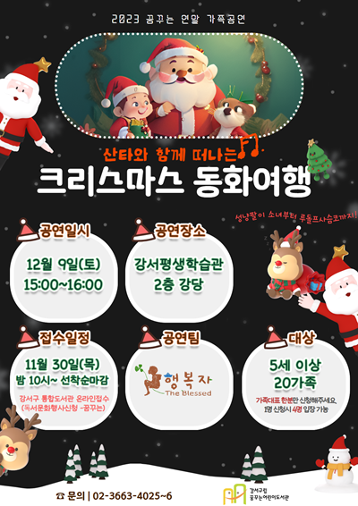 강서구립 꿈꾸는 어린이도서관에서는 12월 9일(토) ‘산타와 함께 떠나는 크리스마스 동화여행’을 공연한다. 5세 이상의 20가족을 대상으로 한다. 성냥팔이 소녀부터 루돌프 사슴코까지의 이야기를 담은 공연극이다.