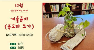 양천구 넘은들공원에서는 12월 7일(목)에 ‘겨울준비-목도리뜨기’ 강좌를 준비한다. 양천구 거주 성인을 대상으로 한다. 단순한 패턴이지만 목도리를 내 손으로 직접 떠보면서 겨울을 준비하는 강좌라고 한다. 참가비는 3,000원이다.