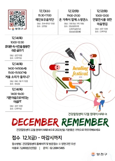 양천구 건강힐링센터에서는 원데이해빛으로 ‘디셈버 리멤버 December Remember 레인보우 음악단’을 진행한다. 초등학교 4학년~6학년 12명을 대상으로 한다. 음악을 들으면서 다양한 활동을 해보는 초등 고학년 음악 프로그램이다. 수강료는 5,000원이다.