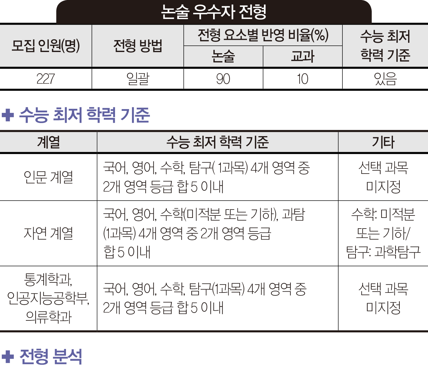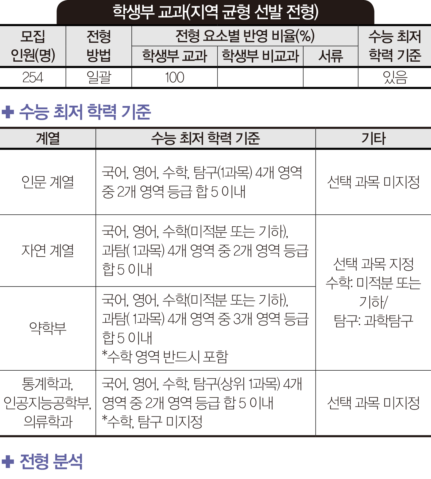 2021학년에 했던 교과 전형을 2022학년엔 지역균형선발전형으로 변경했다. 2021학년에 6.10:1이었던 경쟁률이 2022학년엔 8.93:1로 상승했다. 합격자의 교과 성적은 2021학년과 비슷했다. 인문 계열 학생부 평균 등급은 2021학년에 2.01등급, 2022학년엔 2.04등급이었으며, 자연 계열은 2021학년에 2.14등급, 2022학년에 2.09등급이었다. 종합 전형과 논술 전형도 경쟁률이 전반적으로 상승했다. 특히 논술 전형은 모집 인원이 73명 감소했는데 지원자는 1천300여 명이 증가해 34.34:1의 경쟁률을 기록했다. 교과 전형과 논술 전형은 최저 기준이 완화되면서 실질 경쟁률이 2021학년 대비 상승했다. 종합 전형 중심으로 수시에 지원했던 학생들이 2022학년에는 교과 전형과 같이 지원하거나 1등급대 학생들이 교과 전형에 집중했던 것 같다. 서류 평가에서는 코로나19로 인해 학교 공동 활동보다는 개별화된 노력에 대한 학생부 기록이 눈에 많이 띄었다.종합 전형을 서류형과 면접형으로 구분했다. 모집 단위별로 전형을 달리 설계한 이유는?
