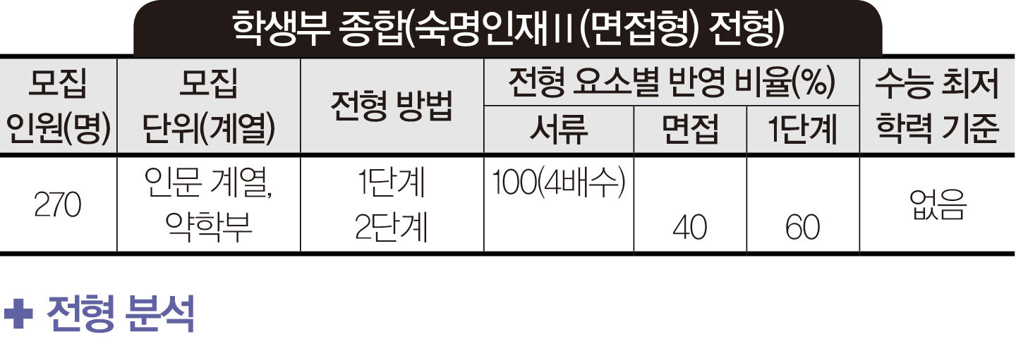 이미지확대 숙명인재Ⅱ(면접형)은 1단계 서류 평가에서 전공 적합성 및 발전 가능성보다 탐구 역량의 배점이 높다. 전공 적합성 및 발전 가능성 300점, 탐구 역량 500점, 공동체 의식과 협업 능력 200점이다. 그러나 전공 적합성 및 발전 가능성의 비중을 상대적으로 낮게 책정한 전형이라고 판단하는 것은 적절하지 않다. 2단계 면접에서 전공 적합성 및 사고력 항목을 다시 한 번 평가하기 때문이다. 진로를 탐색하기 위해 노력하고, 본인의 진로 및 적성에 맞게 학교 활동을 적극적이고 진취적으로 수행해온 학생이라면 과감하게 지원해도 좋을 듯하다.