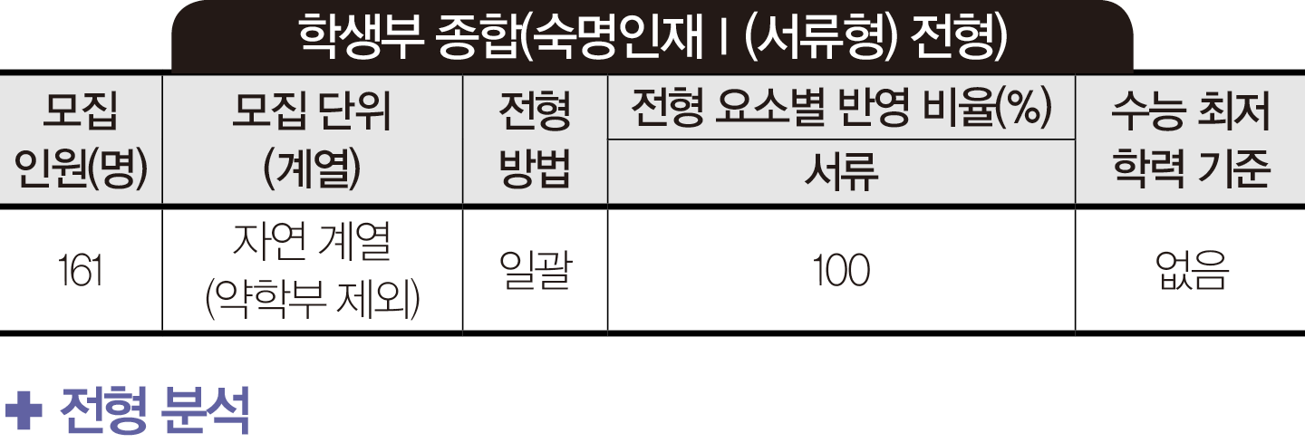 이미지확대 인문계와 약학부는 선발하지 않는다. 약학부를 제외한 자연 계열은 숙명인재Ⅰ(서류형)으로만 선발한다. 숙명인재Ⅰ(서류형)의 평가 항목은 전공 적합성 및 발전 가능성 500점, 탐구 역량 300점, 공동체 의식과 협업 능력 200점이다. ‘전공 적합성 및 발전 가능성’에서는 진로 탐색 노력, 전공에 대한 관심과 이해, 전공(계열) 역량 개발을, ‘탐구 역량’에서는 지적 호기심, 자기 주도성, 탐구 활동, 기초 학업 역량을, ‘공동체 의식과 협업 능력’에서는 공동체 의식 및 리더십, 협업 능력 및 소통 능력을 평가한다. 진로를 탐색하는 과정에서 어떤 노력을 기울였는지, 학교 활동을 통해 지원 전공과 관련한 소양과 자질을 제대로 보여주었는지, 전공(계열) 관련 교과목을 적극적으로 이수했는지 등을 토대로 지원자 본인의 서류에 담긴 경쟁력이 어느 정도인지 검토할 필요가 있다.