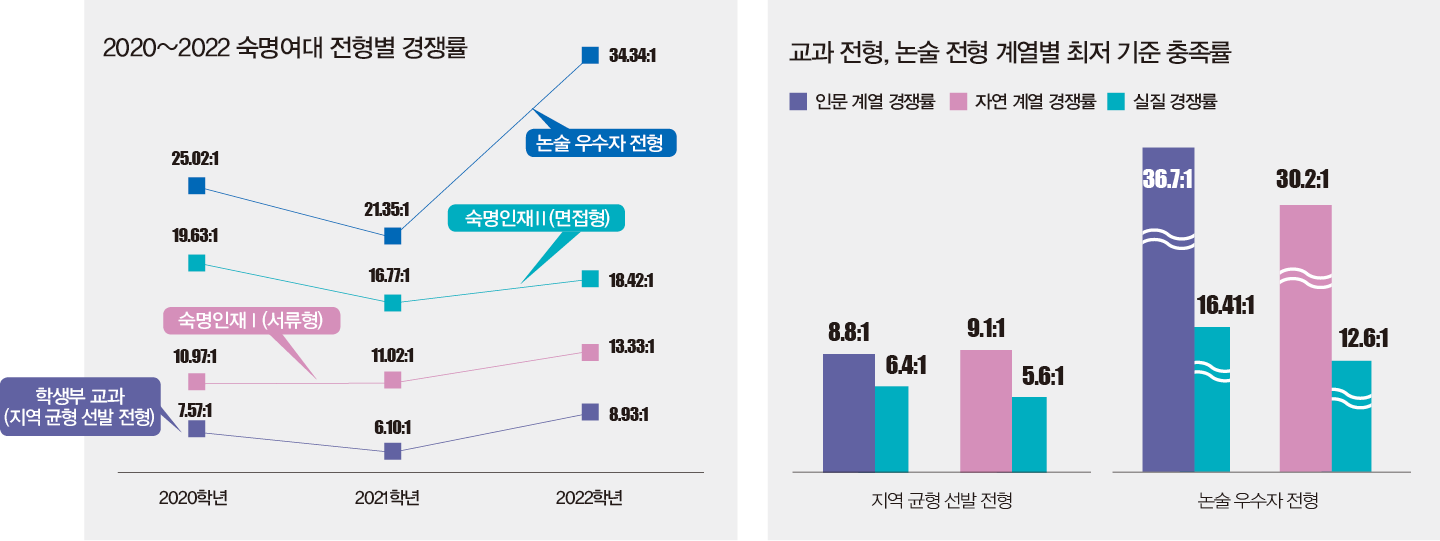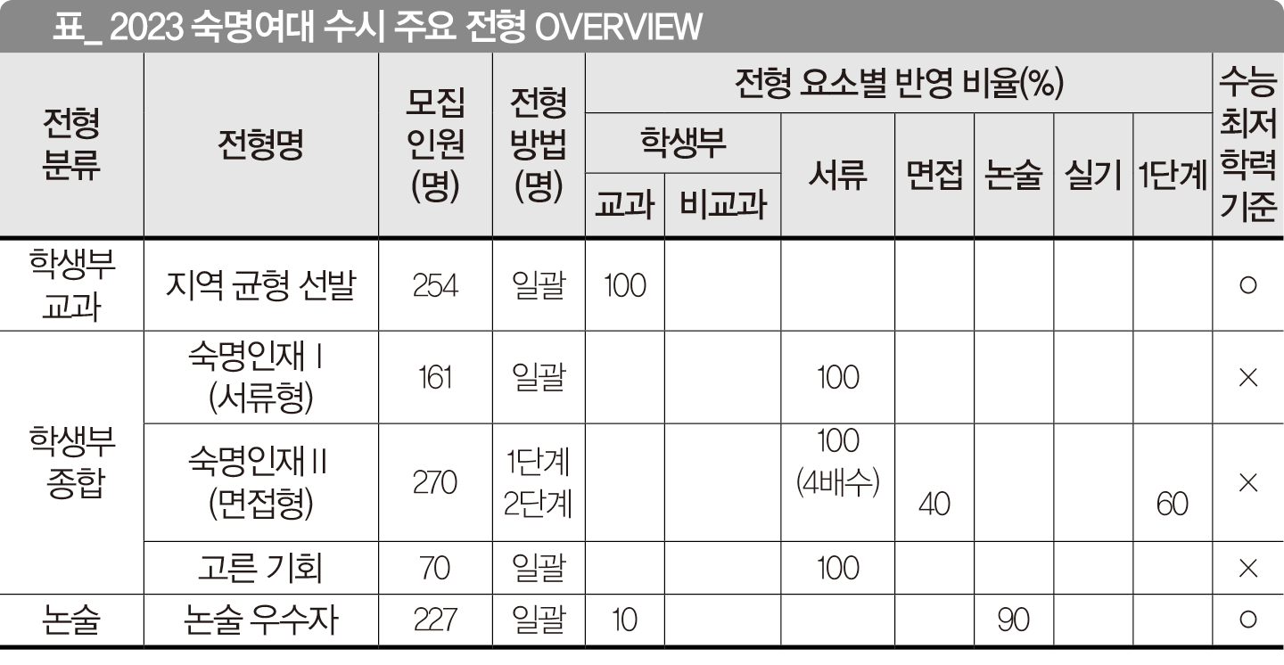 2023학년 숙명여대는 학생부 종합 전형에 변화를 꾀했다. 숙명인재Ⅰ(서류형) 전형에서는 자연계 모집 단위(약학부 제외)만, 숙명인재Ⅱ(면접형) 전형에서는 인문계와 약학부 모집 단위만 선발한다. 논술 우수자 전형에서는 학생부 교과 반영 비율을 30%에서 10%로 줄여 논술의 영향력을 확대했다.