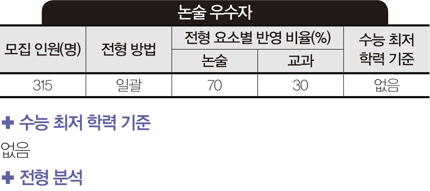논술 우수자 전형은 죽전 캠퍼스에서만 운영한다. 수리 논술은 풀이 과정과 답을 모두 적어야 하므로 평상시 풀이 과정을 꼼꼼하게 작성하는 연습이 필요하다. 답이 틀리더라도 풀이 과정에서 부분 점수를 주므로 최선을 다하는 자세가 중요하다. 논술 전형에서는 최저 기준을 설정하지 않았다. 입학처 홈페이지에 탑재된 모의논술 문제를 실전과 같은 환경에서 풀어보고 가이드 답안을 철저하게 분석한 뒤 논술 고사 강평 영상을 참고해 본인의 부족한 부분을 보완한다면 논술 고사에서 좋은 결과를 얻을 수 있다. 논술 전형 가이드북과 선행평가 영향 보고서도 꼼꼼하게 읽어보길 바란다.