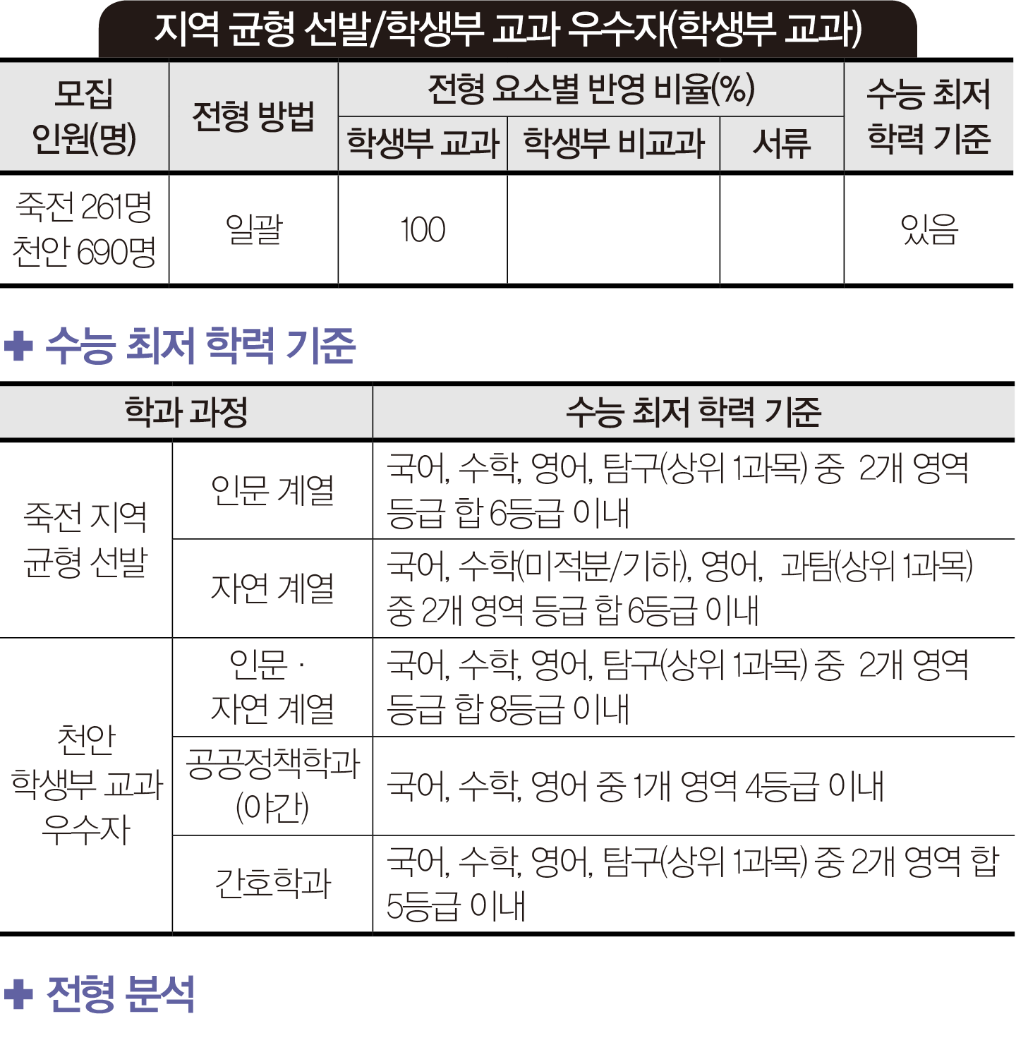 이미지확대 지역 균형 선발은 죽전 캠퍼스의 교과 전형이고, 학생부 교과 우수자는 천안 캠퍼스의 교과 전형이다. 두 전형 모두 학생부 교과 성적만으로 선발하는 일괄 전형이며 수능 최저 학력 기준을 적용한다. 죽전 캠퍼스 지역 균형 선발은 소속 고등학교의 추천을 받은 자만이 지원할 수 있으며 고교별 추천 인원 제한이 없다. 천안 캠퍼스 학생부 교과 우수자는 추천 없이 지원이 가능하다. 학생부는 전 학년을 같은 비율로 반영한다. 재학생은 3학년 1학기까지, 졸업생은 3학년 2학기까지 반영 교과 내 이수한 전 과목을 반영하지만, 성취도로 평가하는 진로선택 과목은 반영하지 않는다. 계열별 반영 교과의 비율은 차이가 있다. 인문 계열은 국어 30%, 수학 20%, 영어 30%, 사회 20%를, 자연 계열은 국어 20%, 수학 30%, 영어 30%, 과학 20%를 반영한다.죽전 캠퍼스 건축학부 건축학전공과 천안 캠퍼스 심리치료학과, 간호학과는 국어 30%, 수학 30%, 영어 30%, 사회·과학 10%를 반영하며 예능과 체육 계열은 국어 40%, 영어 50%, 사회 10%를 반영한다. 최저 기준은 캠퍼스별, 모집 단위별로 차이가 있으므로 확인해야 한다.
