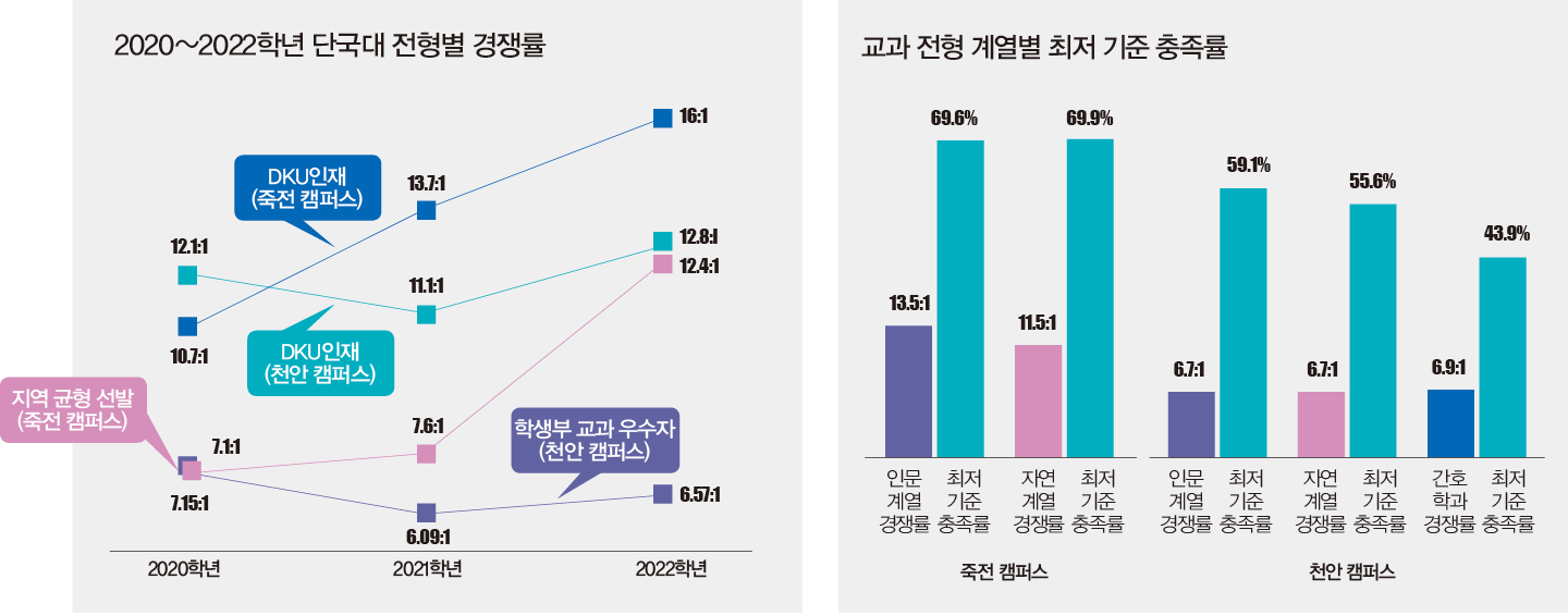 교과 전형의 경쟁률이 죽전과 천안 캠퍼스 모두 상승했다. 죽전 캠퍼스는 지역 균형 선발 전형의 추천 인원을 8명으로 제한해 경쟁률이 감소할 것으로 예상했는데 2021 대비 1천여 명이 증가해 7.6:1이었던 경쟁률이 12.4:1로 상승했다. 주요 대학에서 교과 전형이 신설되면서 해당 전형에 관한 관심이 높았던 것도 경쟁률 상승의 원인으로 보고 있다. 교과 전형 최저 기준 충족률은 죽전 캠퍼스의 인문 계열이 69.6%, 자연 계열이 69.9%였으며 천안 캠퍼스는 인문 계열이 59.1%, 자연 계열이 55.6%, 간호 계열이 43.9%였다. 종합 전형인 DKU인재도 상승했다. 종합 전형에서는 수상 실적을 학기별 1개만 반영하기 때문에 선택에 고민이 있었던 것 같다. 기본적으로 수상 실적은 자신의 장점을 보여줄 수 있는 것으로 선택하는 게 좋다. 특정 수상이 의미가 있는 것은 아니지만, 지원 전공이나 계열과 관련이 높은 수상이라면 긍정적인 평가를 받는 데 도움이 된다.죽전 캠퍼스와 천안 캠퍼스의 특징은?